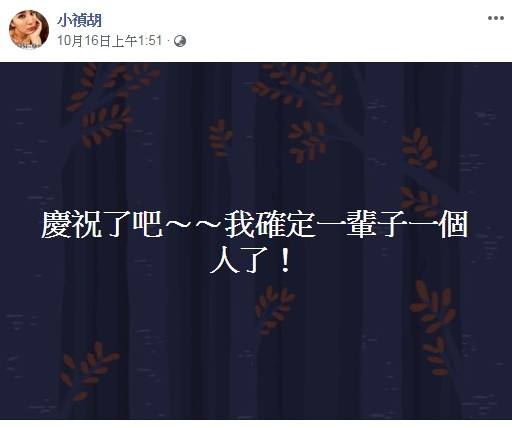 不過,就在兩人復合說傳得沸沸揚揚之時,16日深夜1點多,小禎卻突然在個人臉書上宣布:「慶祝了吧~~我確定一輩子一個人了!」短短一句話,並沒有多做些解釋,感情世界讓外界霧裡看花,雖然寫著「慶祝」兩個字,語氣卻仍帶些滄桑。