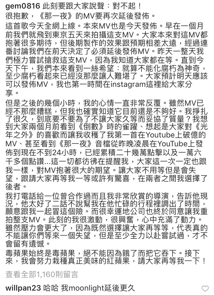 而鄧紫棋也在文中表示MV將會重新拍攝,為此向粉絲說「對不起」。而老戰友潘瑋柏更在Instagram下留言說到「哈哈,我Moonlight延期更久」,試圖想安慰鄧紫棋,而大批網友也都表示願意等待最好的成果。