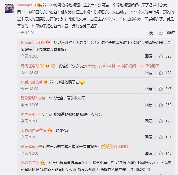 對於公司的細心解釋網友絲毫不買單,認為一開始就砸下很多錢搶票,如今就連場地也出問題,令粉絲無法接受並紛紛表示「這麼大的公司連場地問題都解決不了」、「希望官方能靠譜一點別溜粉了」、「很多人都去北京了,假也請了」。