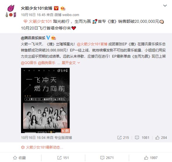 21日,火箭少女的首個實體專輯《撞》即將發行,目前為止4支單曲也都搶先在網路上推出,其中在8月18日上線的首支單曲《撞》至今已達到2千萬銷售額,可見粉絲的大力支持如今卻像被潑了一大桶冷水。