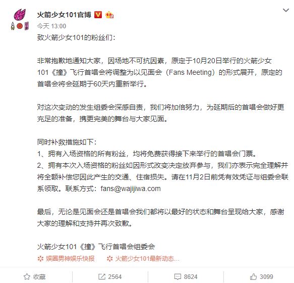 19日下午,火箭少女官方微博突然宣布《撞》首唱會延期消息,並表示是「因場地不可抗因素」。文中顯示,首唱會將在60天內另行舉辦,並將演唱會調整為「見面會」,也提出補救措施讓原先友票的粉絲免費入場,若不想參加公司也願意全額退款,並補助交通費等花用。