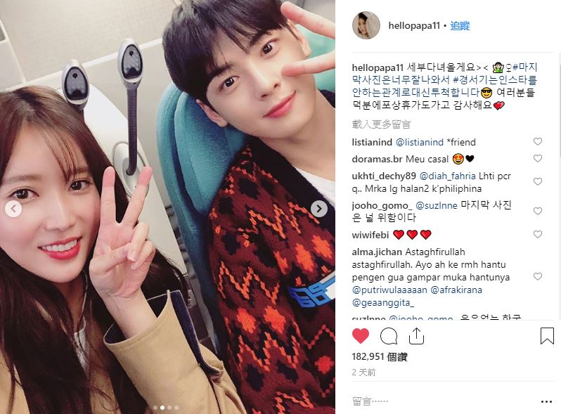工作行程滿檔的車銀優19日,也終於能和同劇女主角林秀香飛往宿霧度假。而林秀香也在Instagram上分享兩人甜蜜合照。字裡行間除透露出國度假的喜悅,除分享兩人合照,更拍了一張車銀優獨照,還自稱「最後一張拍得很好」,並解釋「車銀優不玩Instagram,所以替他發出去了」。