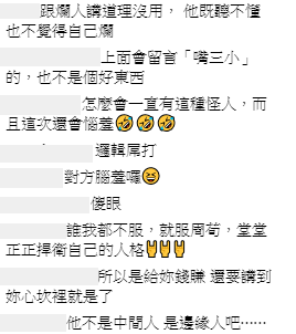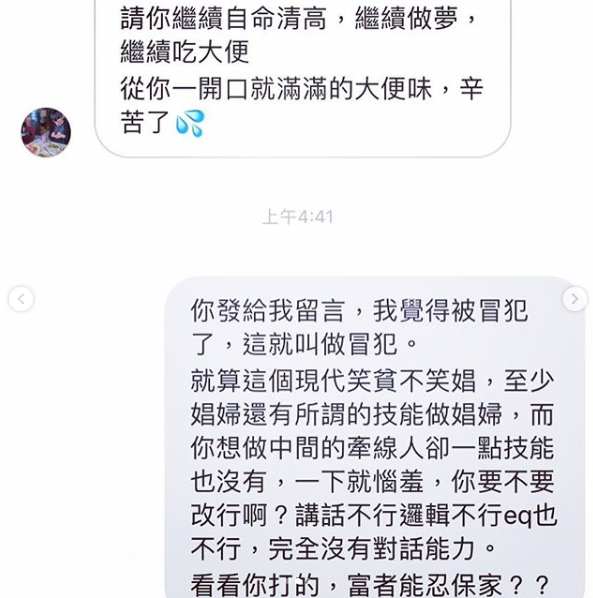 沒想到對方遭嗆之後,竟然瞬間惱羞,打上:「請你繼續自命清高,繼續作夢,繼續吃大便」,而這番言論也再度激怒周荀,她也再度回對方:「就算現代笑貧不笑娼,至少娼婦還有所謂的技能做娼婦,而你想做中間人卻一點技能也沒有,講話不行、邏輯不行、EQ也不行」。