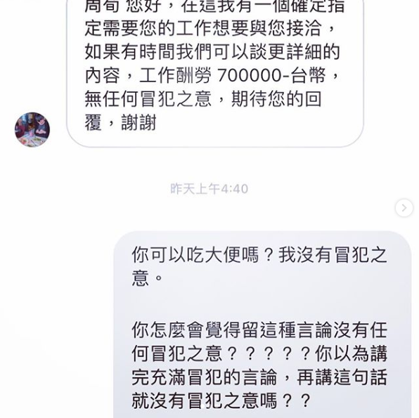 周荀20日在自己的IG上傳對話截圖,其中只見對方開門見山表示:「在我這裡有一個指定需要您的工作想要與您接洽,如果有時間我們可以談更詳細的內容,工作酬勞700000台幣,無冒犯之意」,邀約周荀「兼職」,也讓她看到之後則怒回:「你可以吃大便嗎,我沒有冒犯之意」,更憤怒表示「你怎麼會覺得留這種言論沒有任何冒犯之意」!