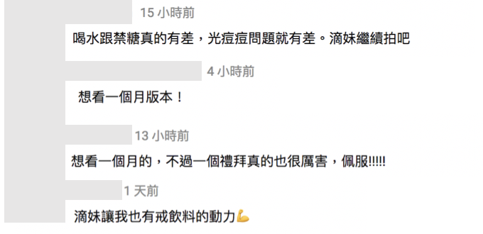 滴妹最後也提到為什麼這次要拍這個挑戰的主要目的,是因為她即將在10/27生日當天發行首支單曲,滴妹也提到:「希望大家10/27能夠準時6點鐘回到滴妹的頻道,一起來支持這首歌。」網友也暴動留言大讚:「喝水跟禁糖真的有差,光痘痘問題就有差。滴妹繼續拍吧」、「想看一個月版本!」、「想看一個月的,不過一個禮拜真的也很厲害,佩服!」