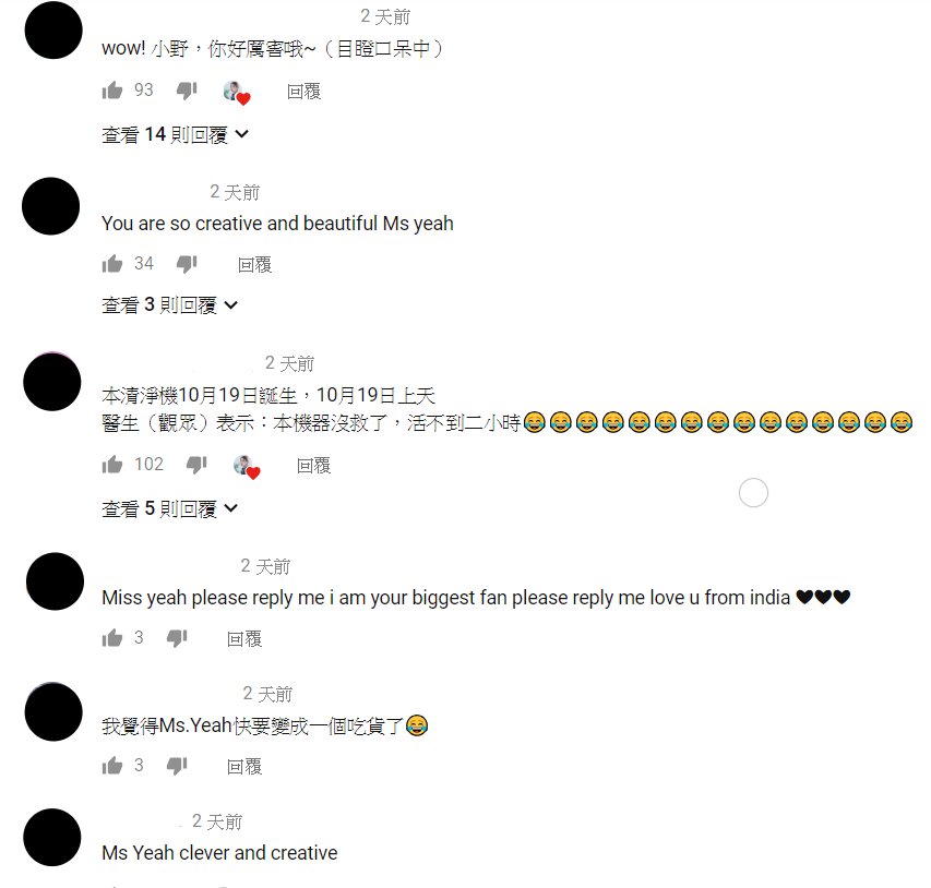 創意無限的她最後還用空氣清淨機內的黑色粒子磨成泥加工,敷在臉上便成了面膜,最後她讓辦公室裡的同事們都敷上了面膜,同事們都開心地笑著,影片的最後,辦公室小野最想要表達的其實還是維持空氣品質,人人都要一起擁有一顆乾淨的肺,影片也讓網友表達認同,在影片下方留言對辦公室小野的敬佩,想必以後還會看到她帶給我們更多意想不到的驚奇。