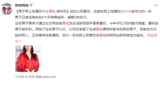 23日,經紀公司對外宣布最新判決結果,以大量不雅影片騷擾雪炫的網友已經被判處6個月有期徒刑,緩期2年執行;而2名合成裸照的網友,已經遭到檢方起訴,正在等待法院通知,另有一名惡意誹謗者,檢方也正在展開調查,公 司最後也嚴正聲明,今後針對惡意網民將採取法律途徑,以維護旗下藝人的安全。