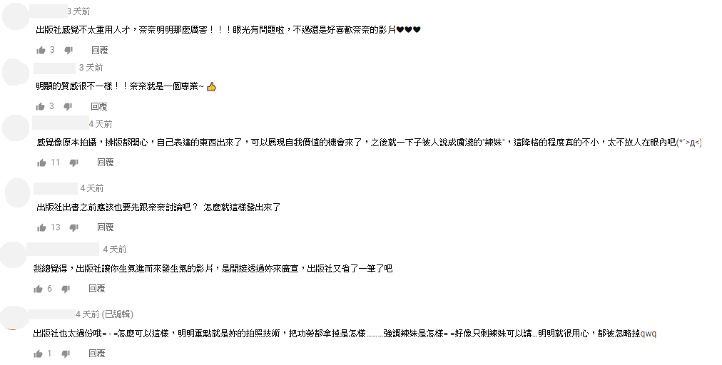 影片播出之後,也有許多網友抱不平:「可以展現自我價值的機會來了,之後就一下子被人說成膚淺的"辣妹",這降格的程度真的不小,太不放人在眼內吧」、「奈奈雖然生氣但還是很詳細介紹新書..真的是很敬業又認真的專業攝影師」、「出版社出書之前應該也要先跟奈奈討論吧? 怎麼就這樣發出來了」、「出版社也太過份哦= - =怎麼可以這樣,明明重點就是妳的拍照技術,把功勞都拿掉是怎樣」。