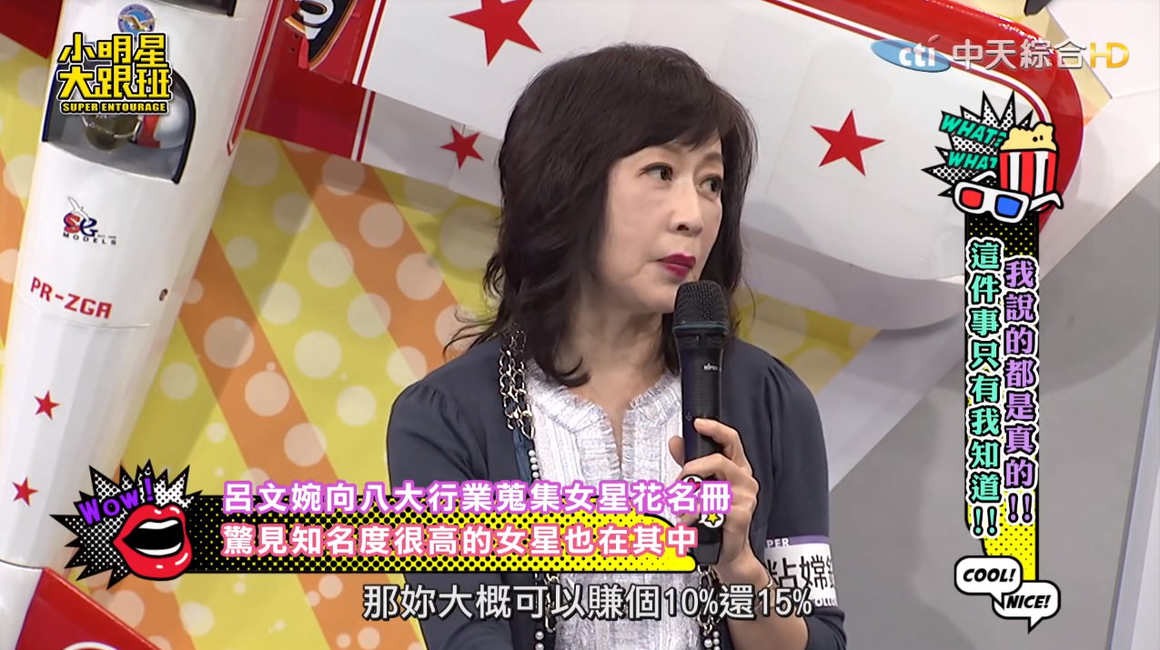 個性嗆辣敢言的資深名嘴「呂文婉」,經常在各大節目驚爆不為人知的內幕消息。近日她又在節目《小明星大跟班》中爆料,過去他曾透過人脈,跑遍各個八大行業,果然被她找到傳說中的「真正的花名冊」,甚至透露一線知名女星一晚的價碼只要6千元,讓眾人相當傻眼。