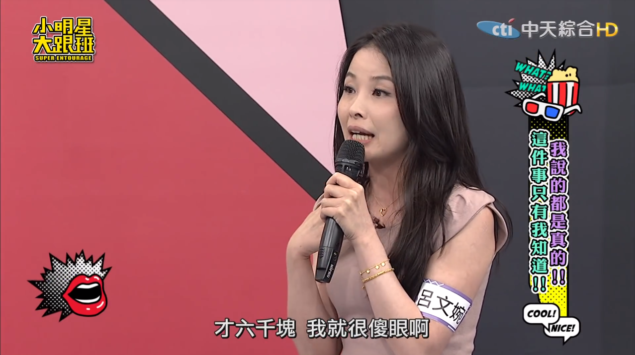 不僅如此,呂文婉還爆料,當年一個經常出現在《玫瑰瞳鈴眼》等類戲劇的知名女星,名字竟然也在花名冊上,而且該名女星的能見度很高,大家很常看到她,是當時正紅的藝人,且還有「小什麼什麼」之稱,長得非常漂亮。只是該名女星一個晚上的價碼竟然只有6千元,讓她看了不敢相信直說「我當場真的傻了!」