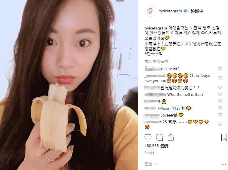 22日,台籍成員周子瑜在官方Instagram分享一張自拍照,並以中韓雙語發文表示「小時候不太在意黃色,不知道為什麼現在這麼喜歡它」。照片中,周子瑜以一雙圓滾大眼看著鏡頭,手裡握著一根已經咬了一半的香蕉,頭髮雖然有些凌亂,卻也相當符合外界心中鄰家女孩的清純形象,網友紛紛回應「黃色真的很適合子瑜」、「我想要成為香蕉」、「子瑜你愛吃香蕉啊」。