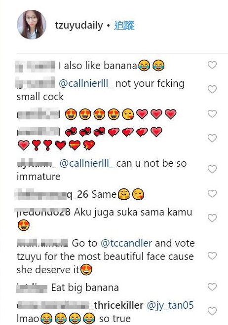 子瑜作為人氣團員,一發照片總是成為外界焦點,這張照片也被廣大網友轉發,不過卻有一名網友以這張照片意淫子瑜,不雅字眼讓網友跳出來保護子瑜。分享的貼文中,大批網友在底下留言說到「想吃大香蕉嗎」、「你是想吃香蕉還是…」,這也讓部分網友槓上惡意留言者,並回應「可以不要那麼幼稚嗎」。