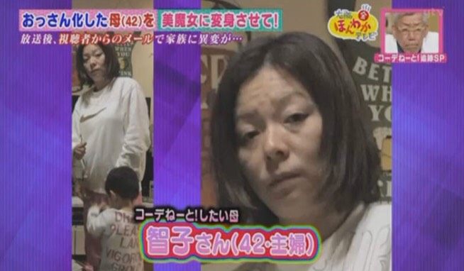 42歲的智子被21歲的女兒嫌棄打扮太邋遢,穿著、化妝都很隨便,甚至很常喝酒回家就趴在玄關上呼呼大睡,更直接被說:「家裡像是有兩個大叔」因此智子就透過節目大改造,成功地擺脫過去邋遢的形象!