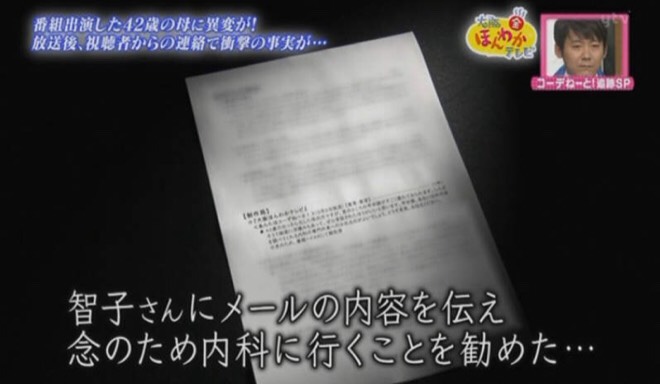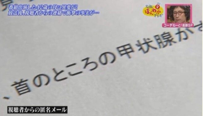 日本綜藝節目有一個單元是專門替人全身大改造,一位42歲的家庭主婦因被女兒川本稚沙葵小姐嫌棄穿著邋遢,被報名參加此節目,上電視之後沒想到意外被眼尖的觀眾發現脖子似乎異常腫大,貼心地寄信提醒後,確實是癌症的初期症狀,這麼剛好的事情就這樣發生了,我們永遠無法預料生命發生什麼意外,也多虧女兒的雞婆、嫌棄,主婦才能上節目還被眼尖的觀眾因此救了一命!