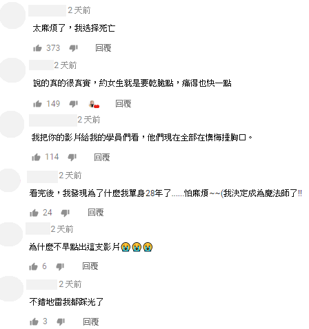 不過影片發布之後,許多網友留言:「我把你的影片給我的學員們看,他們現在全部在懊悔捶胸口。」、「說的真的很真實,約女生就是要乾脆點,痛得也快一點」、「沒有女生可以約就不會踩到地雷」、「真心覺得米砂是少長JJ的漢子」、「為什麼不早點出這支影片」。不過也因為其中有許多要注意避開的地雷,也有網友崩潰:「太麻煩了,我選擇死亡」。