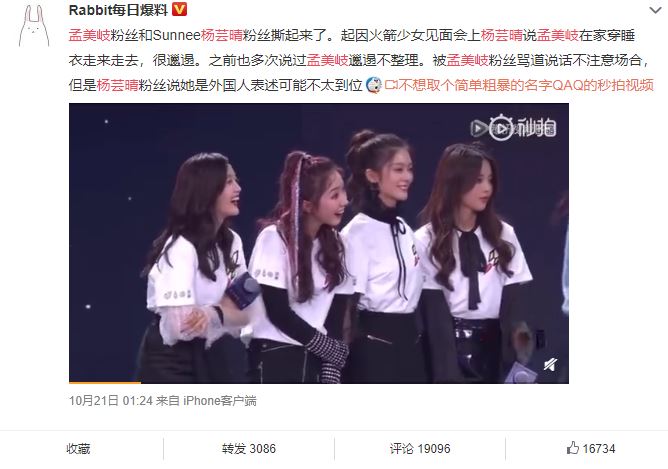 此次孟美岐和Sunnee合體參與廣州活動,良好互動似乎並沒有受到兩家粉絲互撕的尷尬狀況。事實上,20日火箭少女見面會中,Sunnee透露孟美岐在家很邋遢,總是穿著睡衣,此話一出引起孟美岐粉絲不滿,認為Sunnee口不擇言中傷孟美岐,引起兩方粉絲論戰。