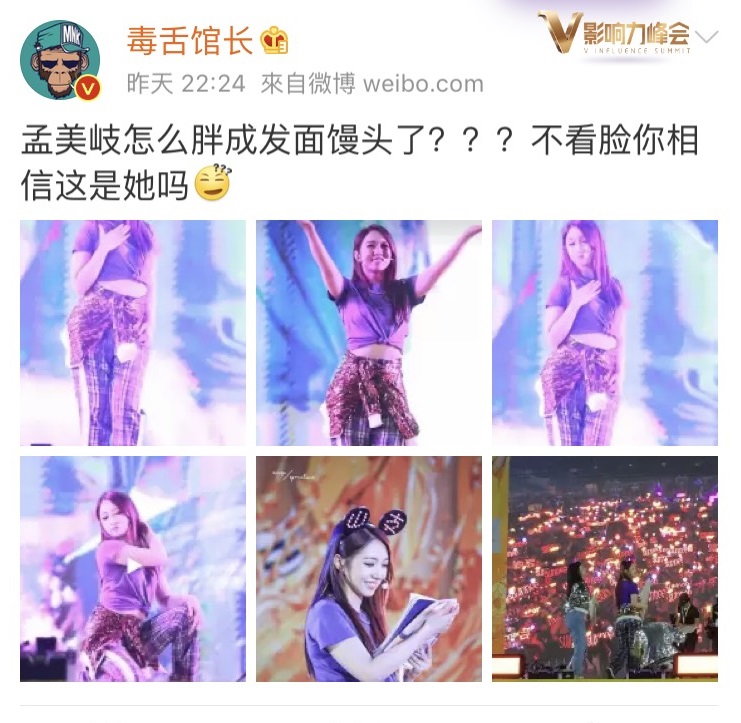 22日晚間,微博一名網友分享一系列孟美岐參與廣州見面會的現場照片,並配文到「孟美岐怎麼胖成發麵饅頭了,不看臉你信這是她嗎」。照片中,孟美岐身穿紫色短版上衣,下身格紋長褲並在腰間綁著一件外套裝飾,而露出的一截腰身,竟然已經不是小蠻腰,而成了水桶腰,引起網友熱烈討論並說到「確實胖了點但沒有這麼誇張,角度問題」、「是比101的時候肉了點」。