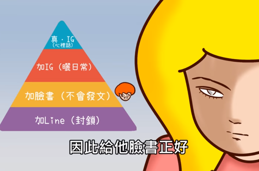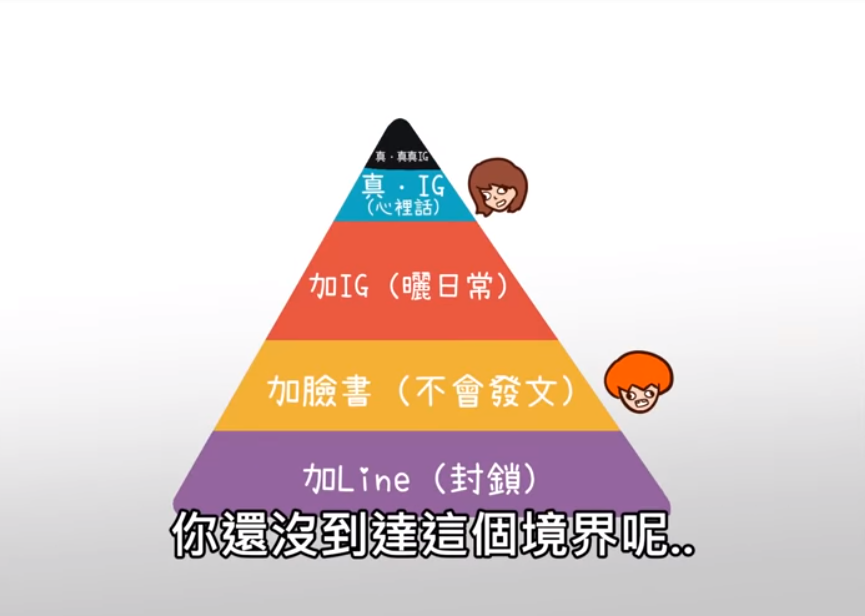 你以為這樣就是全部了嗎?人們內心的攻防戰可比你能想到的更深遠,你的閨蜜真的也把你當作他的閨蜜嗎?答案可不一定,其實金字塔還有最最上層,所謂的「真·真真IG」才是交友境界的最高級,表面上好像加IG已經是很好的朋友了,但人們總是會為自己再留一手,你也是擁有超級機密的「真·真真IG」帳號的人嗎?只能說隨著時代進步人的內心也越來越複雜了呢。