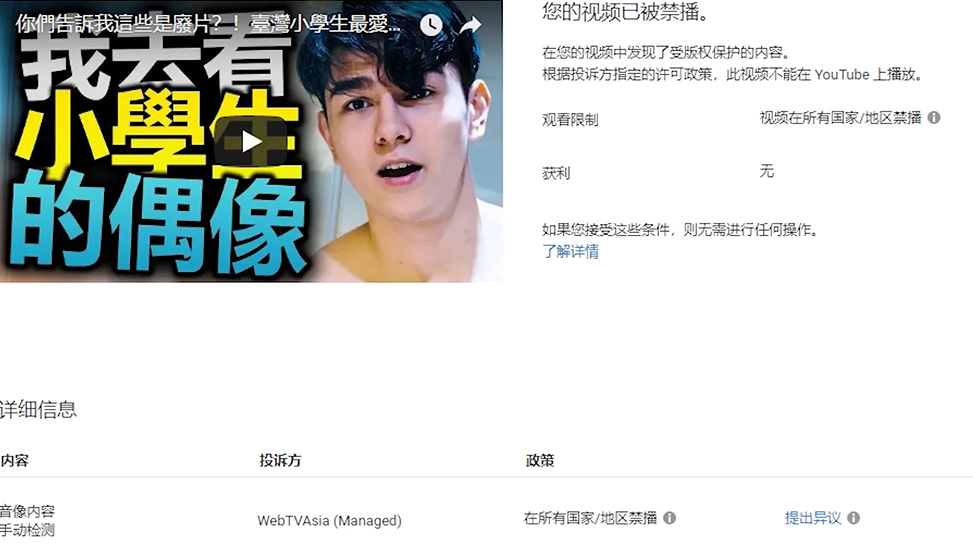 錫蘭猜測自己的影片兩度被禁,應該是因為在影片中他嘲諷小玉,而被「webTVAsia」禁播。當時許多網友提出應該是youtube系統檢測禁播,而非小玉公司,這次錫蘭也秀出截圖,表示確實是「webTVAsia」手動檢測投訴才被下架,他更直言:「這個不是一個正常的事情,youtube很多規則讓大公司好」,指出youtube打壓小型創作者,獨厚大公司!