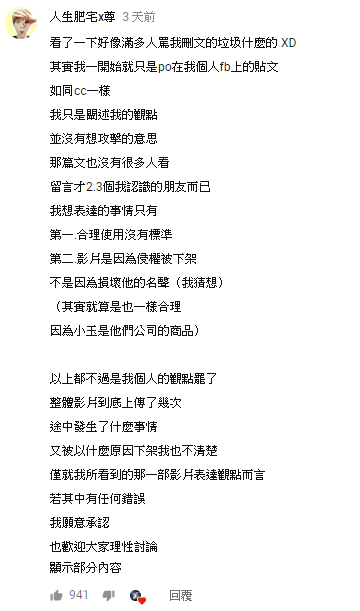而影片發布之後,尊後來便透過私人臉書回應:「其實我看的時候有一點傻眼」,他也直言「合理使用」定義模糊:「在主張合理使用的情況下,的確可以不與著作權法相互牴觸引用他人創作,但是否為合理使用,是由法官認定不是自己判別」,表示首先錫蘭的論點就站不住腳,在來他也指出錫蘭暗指小玉公司「webTVAsia」操作一事,是錫蘭帶風向讓大家去攻擊小玉:「然而底下大部分的嗑瓜群眾依然群起圍攻受害者」。