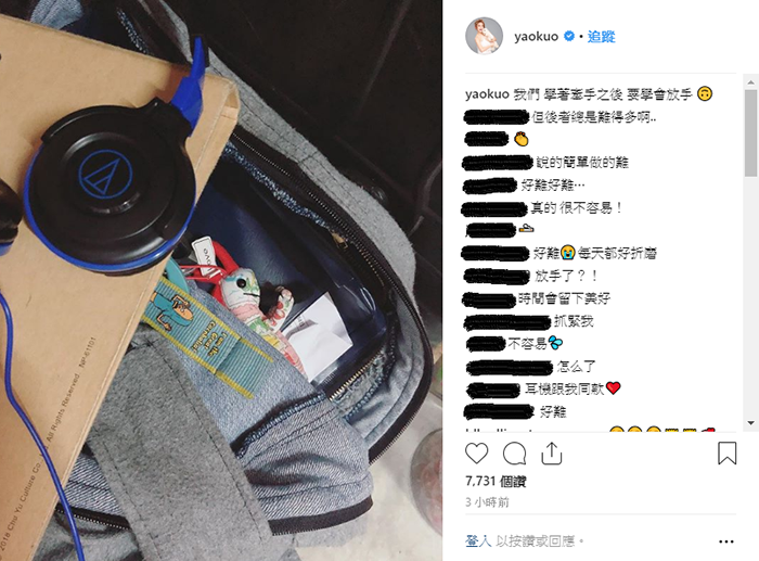 女星郭書瑤(瑤瑤)於拍攝電視劇《稍息立正我愛你》時,和比她小6歲的王以綸擦出愛火,兩人穩定交往一年,還曾在8月時還被捕捉到兩人親密約會,但是郭書瑤在24日在IG上PO出一句簡短的話,看似話中暗示她現在的感情狀態,引起許多網友和粉絲猜想難道是感情出了問題,造成網路上的討論。IG的PO文中寫到「我們,學著牽手之後,要學會放手。」,不只有她抒發心情的話語,她更PO出包包內物品凌亂散落的照片,疑似真的發生了什麼事,這讓不少粉絲們聯想到她和男友以綸的關係是否發生變化。