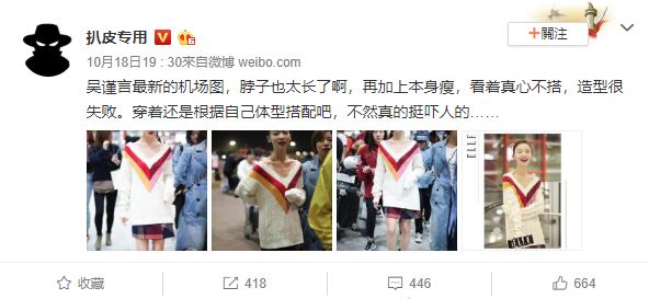 近日,吳謹言現身機場的照片被網友瘋傳,原因是因為身穿V領的吳謹言,胸前的骨頭全都坦露無遺。由於照片時在怵目驚心,網友不禁擔心吳謹言的身體狀況,更認為她的身材有些病態,並表示「我被嚇到了」、「感覺像科幻片裡的怪物」、「好像鴕鳥」。
