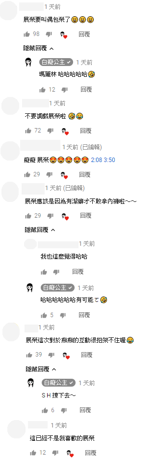 影片播出之後,許多網友紛紛留言:「展榮要叫偶包榮了」、「不要調戲展榮啦」、「展榮應該是因為有潔癖才不敢拿內褲啦」、「展榮害羞的時候太可愛了吧」、「展榮這次對於痴痴的互動很招架不住喔」、「展榮整個超害羞」、「這已經不是我喜歡的展榮」,對於痴痴和展榮的互動提出討論。