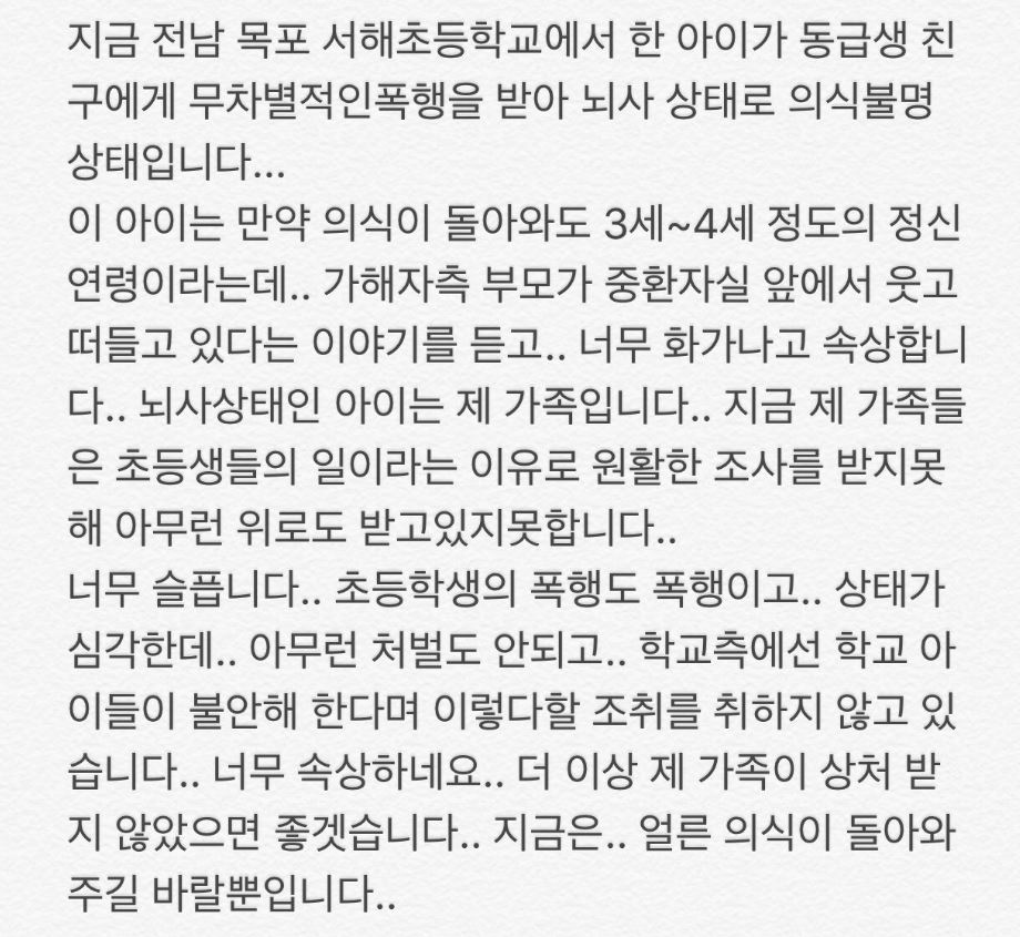 Hoon再指出,校方竟以「會讓學校孩子不安」為由,沒有對此做出懲處,並表示「太傷心了...小學生之間的暴行也是暴行啊...情況這麼嚴重...卻沒有任何處罰...」,文末他也懇求外甥盡快恢復意識。