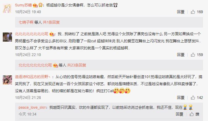 此前,楊超越就曾在專訪中透露,自己擁有「抓老鼠」絕活,不過影片一出仍引起熱烈回應。網友認為古靈精怪的楊超越如今又再添一筆神蹟,並表示「天不怕地不怕的楊超越」,也有網友提醒楊超越有偶像包袱,並說到「請把那隻老鼠放下,你是個仙女」、「請少女偶像不要那麼放飛自我」,更有網友玩笑稱道楊超越是「貓系女漢子」。