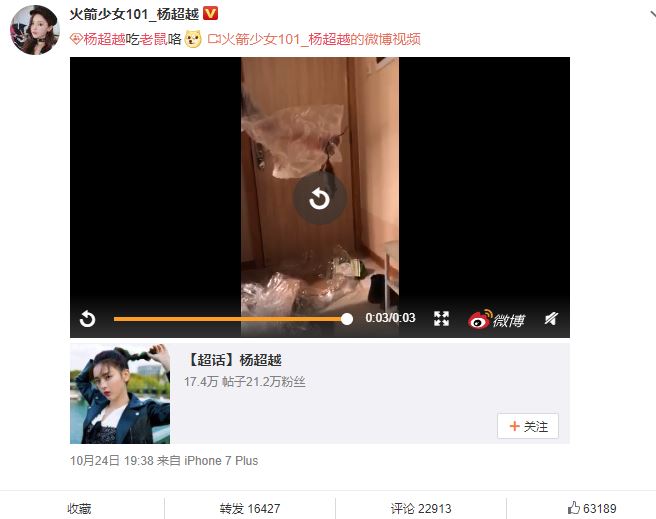24日晚間,楊超越在自己的微博公開短短3秒的影片,影片中,她以塑膠袋套手抓起老鼠的尾巴,眼看老鼠在半空中不斷掙扎,一旁的人都嚇壞了不停尖叫,楊超越卻十分淡定,甚至揚言「要吃老鼠」。
