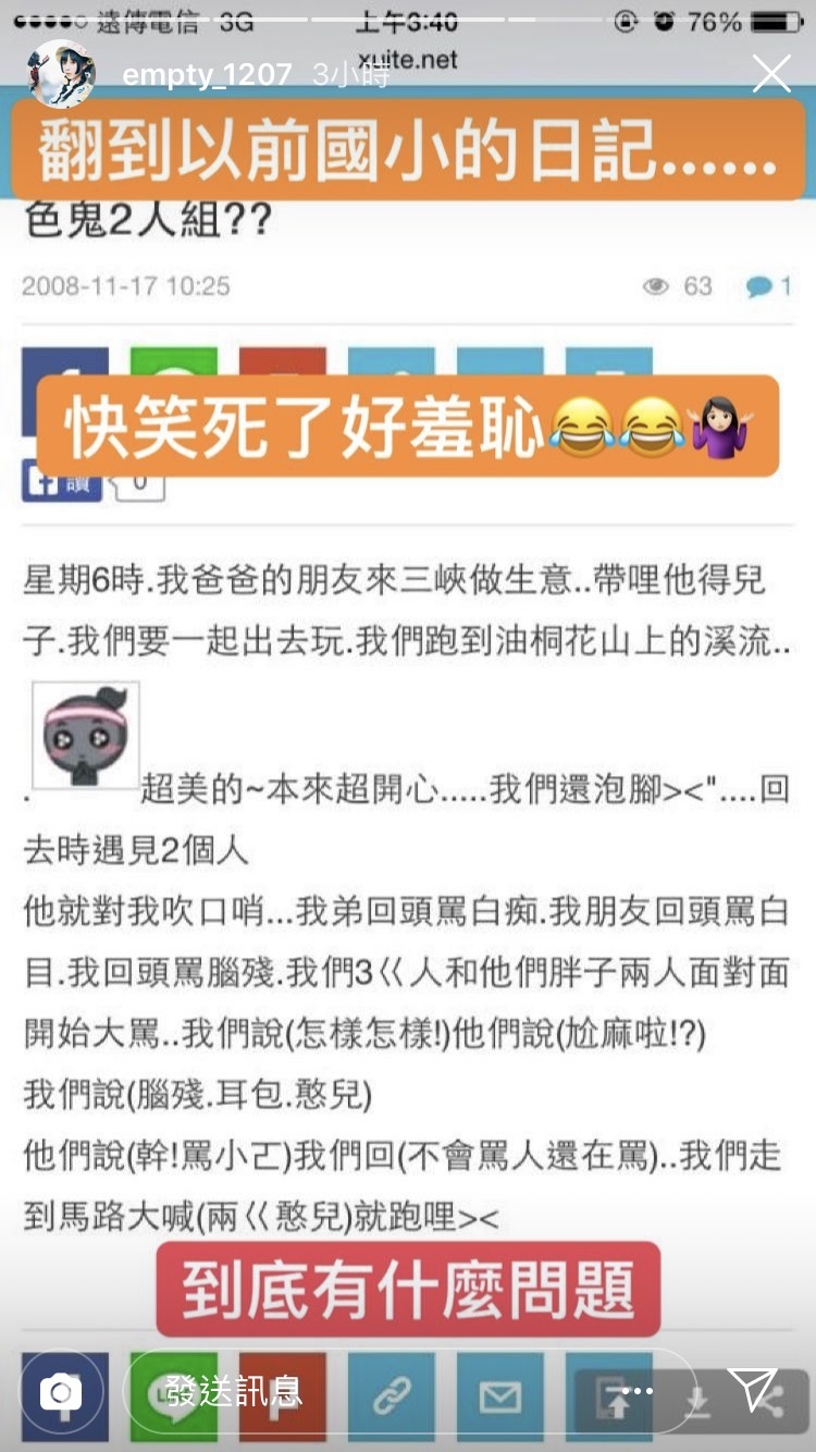 本本24日發布限時動態,其中她公開了自己國小時寫的日記,其中充滿注音文及顏文字,相當可愛!不過有趣的是,她在內文中提到自己遇到兩個色鬼:「回去時遇見兩個人,他就對我吹口哨」,更敘述當時自己和弟弟及友人都回頭對色鬼大罵:「白癡、白目、腦殘」,之後更是和對方面對面起爭執,場面相當火爆!後來則跑到馬路中間大喊:「兩個憨兒」,還罵完就跑。