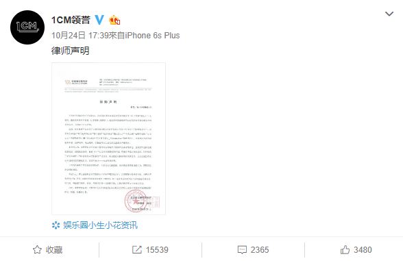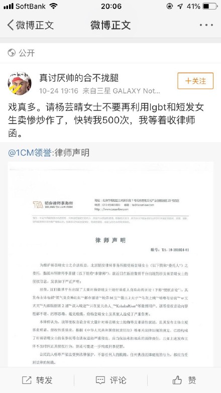 針對網友連日霸凌,24日,楊芸晴的原生公司1CM領譽也在微博發表聲明揚言提告。聲明中明確指出幾個微博帳號,並表示名單中的博主已經涉及人身攻擊,要求他們刪去侮辱評論,否則將追究法律責任,對此卻有粉斯在底下轉貼聲明,並表示不害怕公司提告威脅。