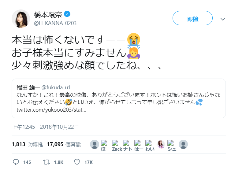 突然看到這樣嚇人的表情,別說是年幼的小孩了,連大人可能都會嚇一跳啊,不過也讓人見識到橋本環奈驚人的「顏技」,網友也回復她的推文,說她平常太可愛了,突然這麼做實在是嚇死人,也有人稱讚她逼真的演技連小嬰兒都可以直接感覺到,以後橋本環奈還會帶給我們什麼樣的演技呢,大家就一邊期待一邊小心不要被她的「顏技」嚇到了。