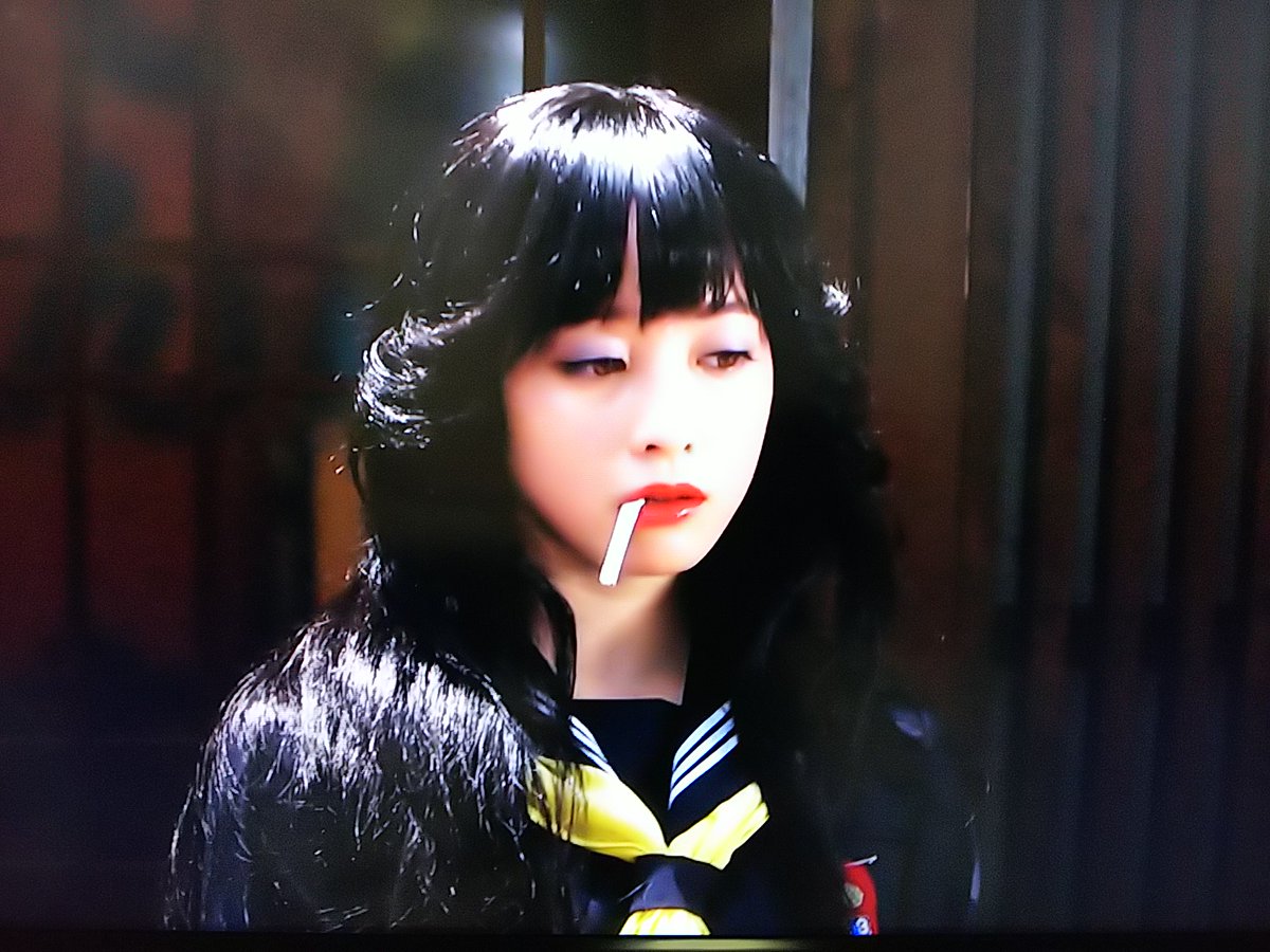橋本環奈在「我是大哥大」日劇中飾演一位叫作京子的「前不良少女」,是個生氣起來比誰都還要恐怖的女生,但是因為喜歡主角伊藤的關係,所以在伊藤面前超會裝可愛跟賣萌,而橋本環奈之所以會展現把小朋友嚇到哭的表情,原因就是因為京子正在打架,而不小心被伊藤發現,為了不讓伊藤認為自己是不良少女,所以她盡全力的裝可愛,還騙伊藤說自己是在演話劇,一等到伊藤離開她便瞬間翻臉。