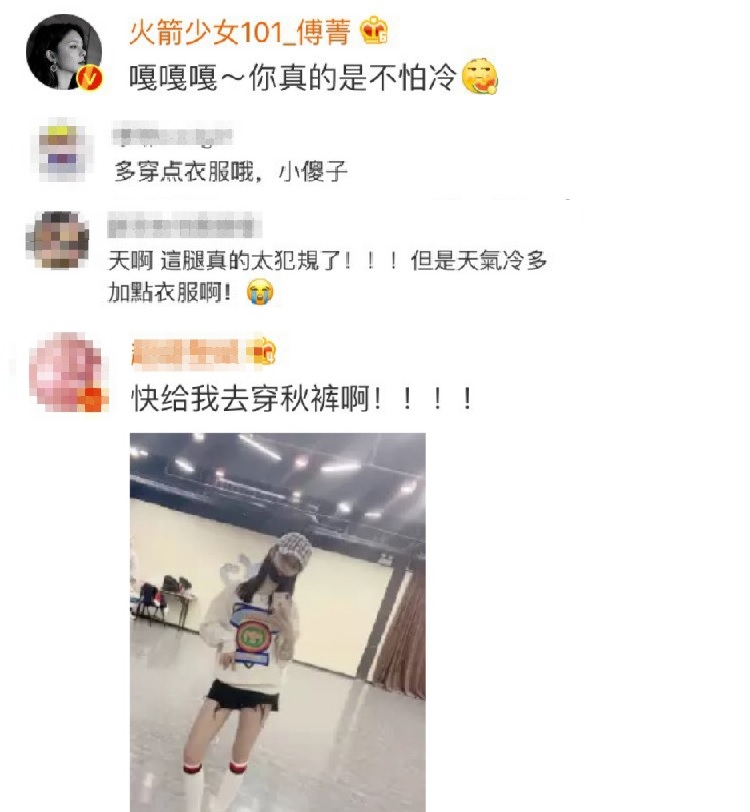 貼文一上傳,就引得許多粉絲們的關心:「多穿點衣服哦,小傻子」、「天啊 這腿真的太犯規了!!!但是天氣冷 多加點衣服啊!」、還有人搞笑說:「快給我去穿秋褲啊!!!!」,特別的是同是火箭少女的成員傅菁也前來回覆:「嘎嘎嘎~你真的是不怕冷」。