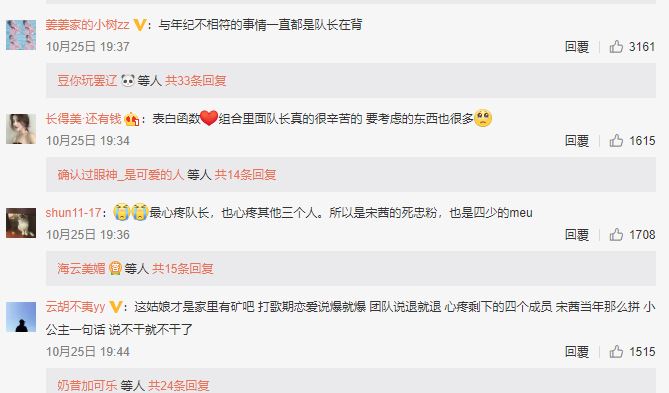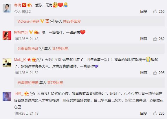 25日,隊長宋茜似乎也發文表示尊重雪莉當時的決定。文中寫到「每個人都有自己想要走的路和必須要走的路,不要停下腳步,走好,無悔」,對此大批網友也湧入支持,並紛紛說到「最有擔當的隊長」、「姐姐竟然回應了,四年來第一次,姐姐真大氣」。