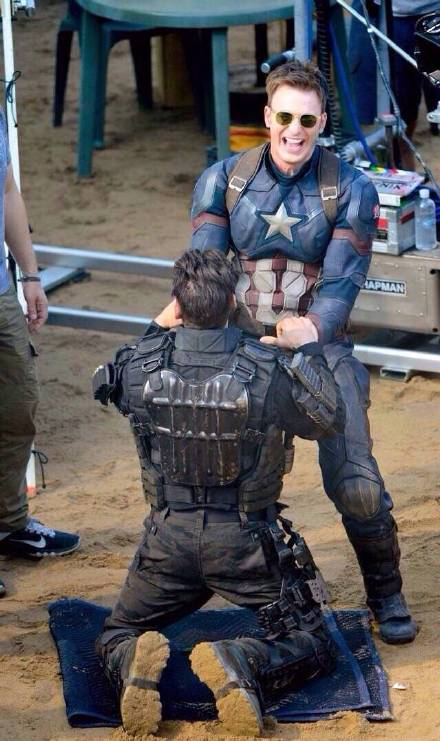 ▼法蘭克·葛里洛在拍攝《美國隊長》系列電影時,與克里斯伊凡(Chris Evans)在片場的照片。