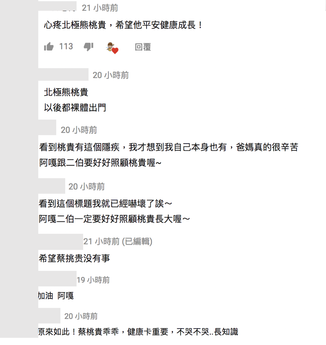 影片中也提到如果誘發的話可以請教「阿滴」,蔡阿嘎也開玩笑的表示:「還是說異味性皮膚炎的患者就可以長得蠻帥的,英文也不錯」甚至還開玩笑說要誘發看看蔡桃貴會不會開始講英文,和他說聲:「Hi Dad~」,阿滴本人也親自留言表示:「好好照顧可以控制的很好~」,許多網友看完這段影片也心疼地表示:「心疼北極熊桃貴,希望他平安健康成長!」、「北極熊桃貴以後都裸體出門」、「看到桃貴有這個隱疾,我才想到我自己本身也有,爸媽真的很辛苦,阿嘎跟二伯要好好照顧桃貴喔~」、「希望蔡挑贵没有事」、「看到這個標題我就已經嚇壞了誒~阿嘎二伯一定要好好照顧桃貴長大喔~」、「原來如此!蔡桃貴乖乖,健康卡重要,不哭不哭..長知識」、「希望她能好好平安的長大,不過看他在桌上動來動去的還是想說一聲好可愛」