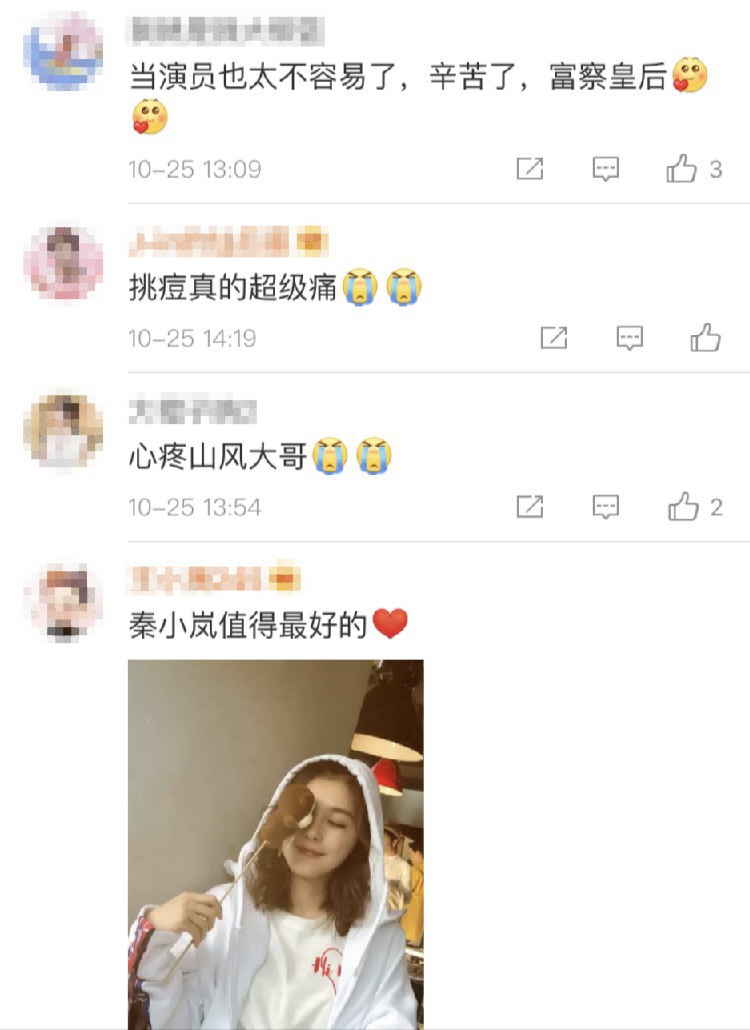 此片段在網路上流傳後,引起許多網友心疼的說:「當演員也太不容易了,辛苦了,富察皇后」、「挑痘真的超級痛」、「心疼山風大哥」、「秦小嵐值得最好的」。