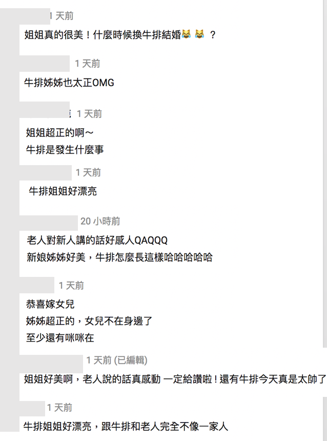 網友看完這則老人嫁女兒的影片後,網友一面倒表示牛排姐姐非常漂亮,紛紛留言表示:「姐姐真的很美!什麼時候換牛排結婚?」、「牛排姊姊也太正OMG」、「姐姐超正的啊~牛排是發生什麼事」、「牛排姐姐好漂亮」、「恭喜嫁女兒,姊姊超正的,女兒不在身邊了至少還有咪咪在」、「姐姐好美啊,老人說的話真感動 一定給讚啦 ! 」、「新娘姊姊好美,牛排怎麼長這樣哈哈哈哈哈」