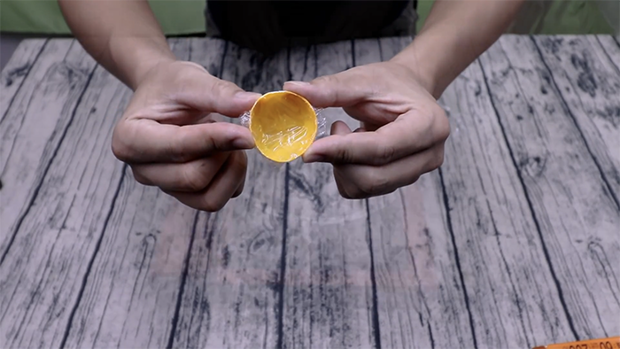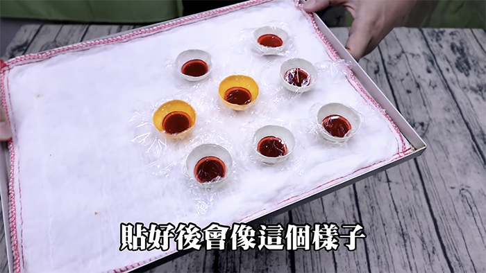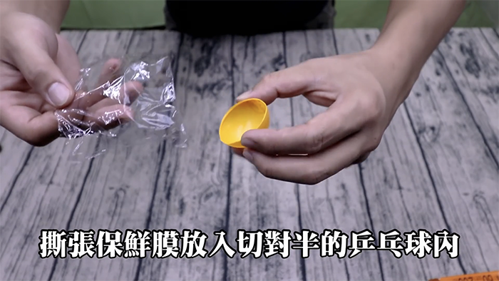 影片一開頭阿戎也提到這次要製作的眼球果凍非常恐怖,連他都會被「丟青嚇」的程度!首先要準備需要用到的器材和模具,需先在烤盤上方放置一條濕抹布,以及準備一顆乒乓球,並且把中間剖開,再將保鮮膜放置在乒乓球中間,如此一來就完成了事前的器具準備。