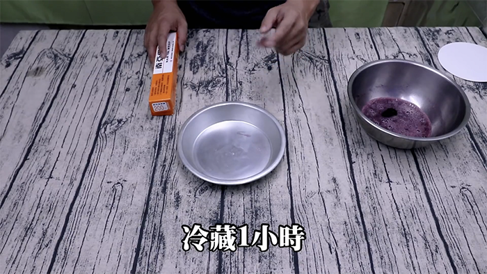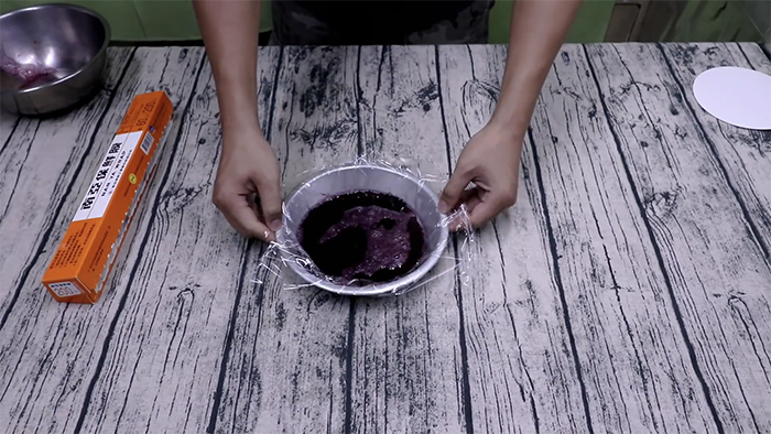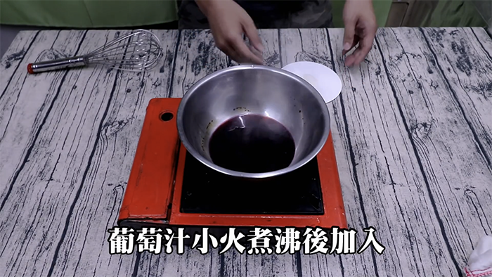1. 先用小火將葡萄汁煮沸 2. 加入寒天粉,並攪拌均勻 3. 準備小盤子墊上保鮮膜後,將葡萄汁倒入其中,送至冷藏一個小時