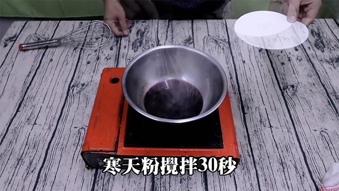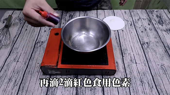 1. 將水煮沸後,加入兩滴紅色食用色素 2. 加入寒天粉,並攪拌均勻 3. 準備小盤子墊上保鮮膜後,將紅色液體倒入其中,送至冷藏一個小時