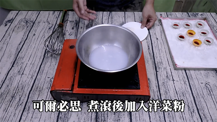 1. 將可爾必思煮沸後,加入洋菜粉 2. 降溫至60度以下