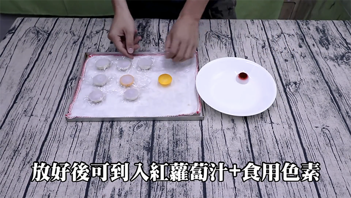 接著即是準備將眼球製作出來的過程,使用小花嘴將葡萄汁按壓出多個圓圈,再將其放置乒乓球內,完成黑色的眼珠。再來將大花嘴在血絲上按壓出圓圈,在蓋置眼珠上方,最後是將降溫後的眼白倒入乒乓球中,再拿去冷藏2小時後脫模及完成完整的眼球。擺盤後,再將紅蘿蔔汁和食用色素倒入盤內,恐怖的眼珠果凍就大功告成了。