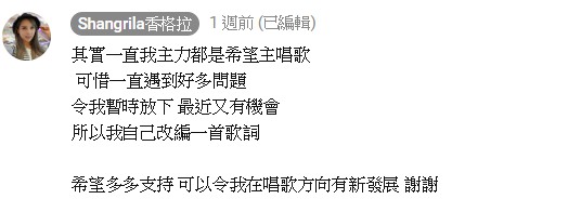 仙氣十足的外表,搭配空靈美聲,讓許多網友們聽得如癡如醉,香格拉也在自己的評論表示:「其實一直我主力都是希望主唱歌,可惜一直遇到好多問題,令我暫時放下,最近又有機會,所以我自己改編一首歌詞,希望多多支持,可以令我在唱歌方向有新發展,謝謝」