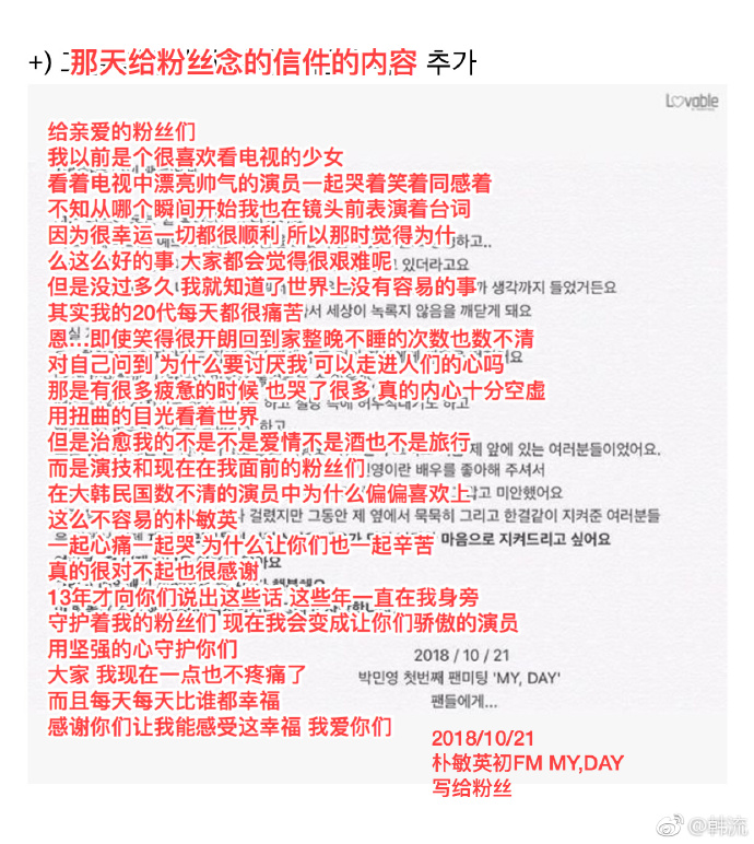信中,向來報喜不報憂的朴敏英坦承,人生邁入30歲以前的他,20出道以後曾陷入憂鬱長達13年的時間,讓粉絲相當不捨。信中透露自己的演員夢,是因為從小是個「電視兒童」而萌芽,不過幸運出道後,外界的輿論壓力讓她深感「世界上沒有容易的事」、「我的20歲每天都很痛苦」。