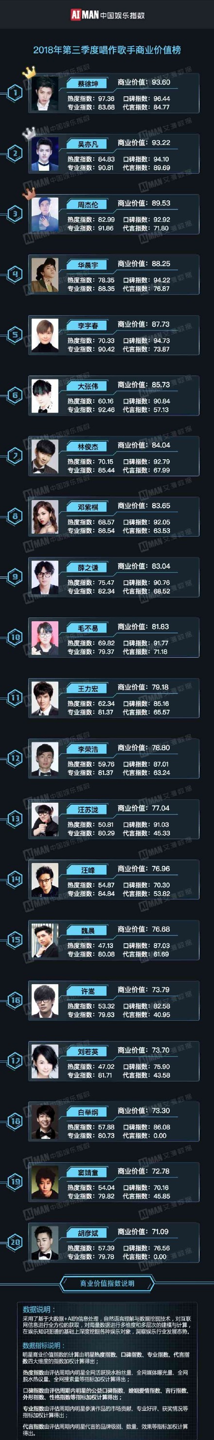 前五名分別由蔡徐坤(偶像練習生)、吳亦凡(中國新說唱)、周杰倫(中國好聲音)、華晨宇(明日之子)、李宇春(明日之子)拿下,位居第一的是在陸綜選秀節目《偶像練習生》中以第一名C為出道的男團《nine percent》隊長「蔡徐坤」,其商業價值有93.60,且熱度與口碑指數也都獲得了97.36與96.44的極高分數,從出道話題與熱度就一直居高不減,其單曲的準備也備受關注。