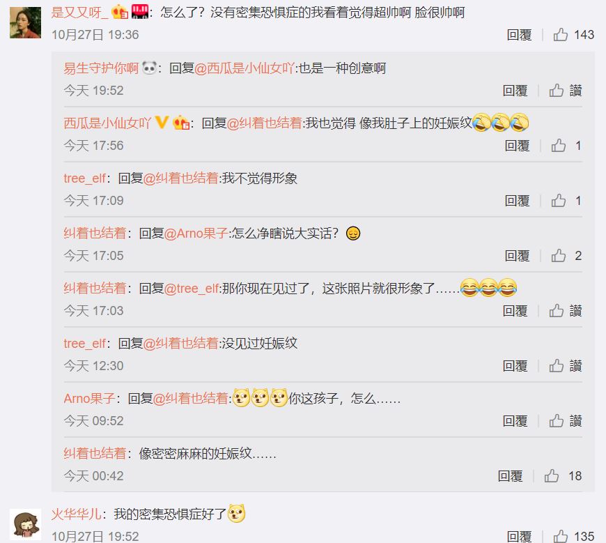 不過,爾後易烊千璽脫下土黃色毛衣,單穿深色印花襯衫站在樹下拍照,照片中的易烊千璽,全臉布滿陽光映照下產生的樹影,有些網友認為照片十分有意境,但更多人認為密集恐懼症就快爆發,並紛紛表示「像我肚子上的妊娠紋」、「我的密集恐懼症好了」,照片評價極為兩極。