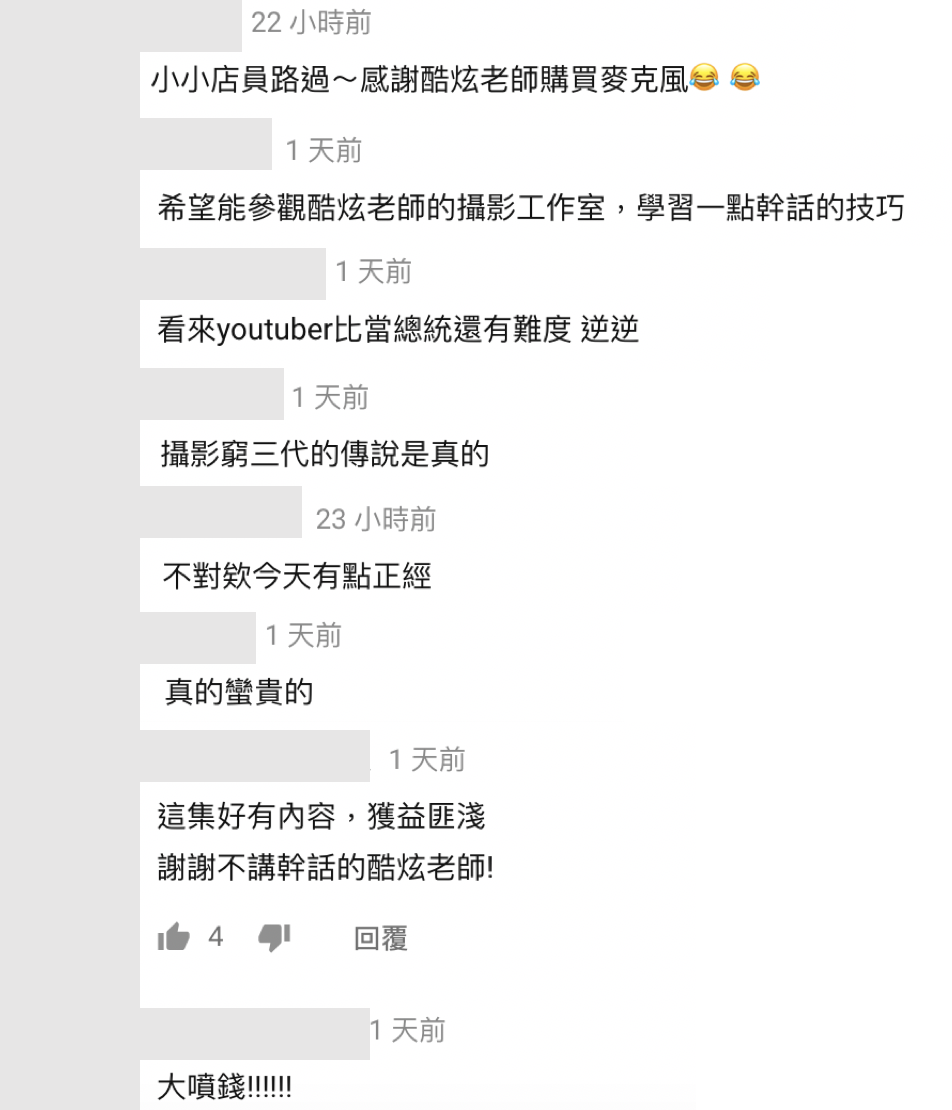 看完影片網友也紛紛在下方留言表示:「希望能參觀酷炫老師的攝影工作室,學習一點幹話的技巧」、「看來youtuber比當總統還有難度」、「真的蠻貴的」、「攝影窮三代的傳說是真的」、「不對欸今天有點正經」、「大噴錢!」,也看見影片中賣麥克風的老闆也在下方留言:「小小店員路過~感謝酷炫老師購買麥克風」,可見網友也認為當YouTuber是非常昂貴的。